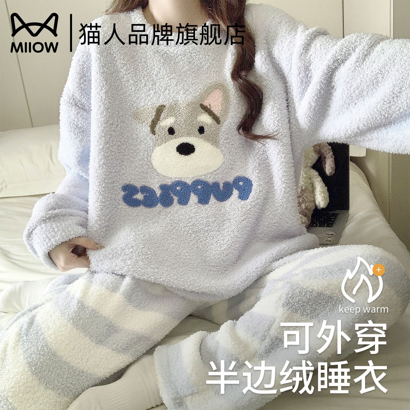 猫人半边绒睡衣女款秋冬季保暖卡通可爱加厚绒外穿家居服套装2026