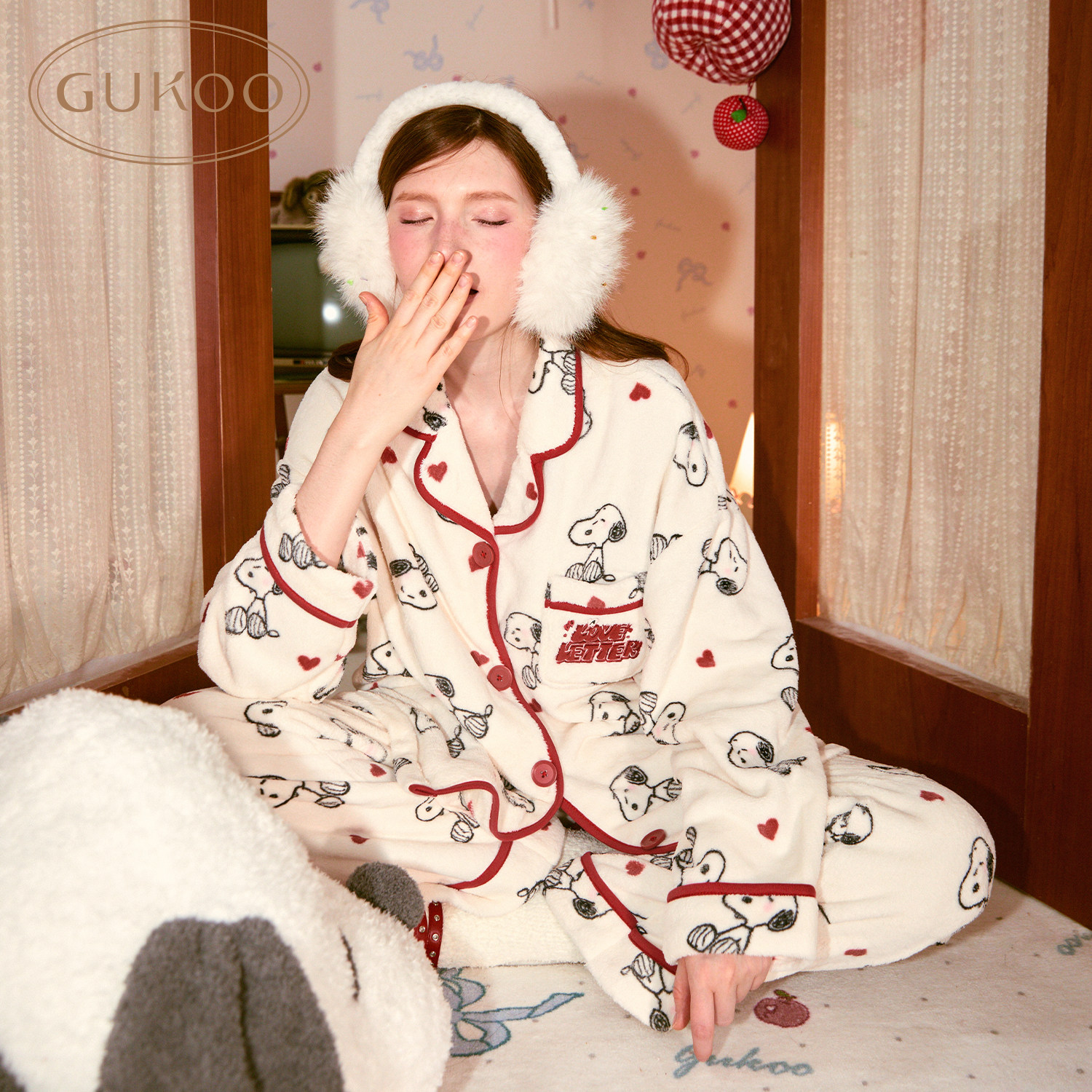 Gukoo/果壳睡衣女史努比珊瑚绒卡通印花可外穿保暖家居服套装