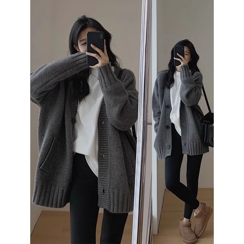 日系复古v领加厚中长款灰色针织开衫女秋冬韩版慵懒宽松毛衣外套