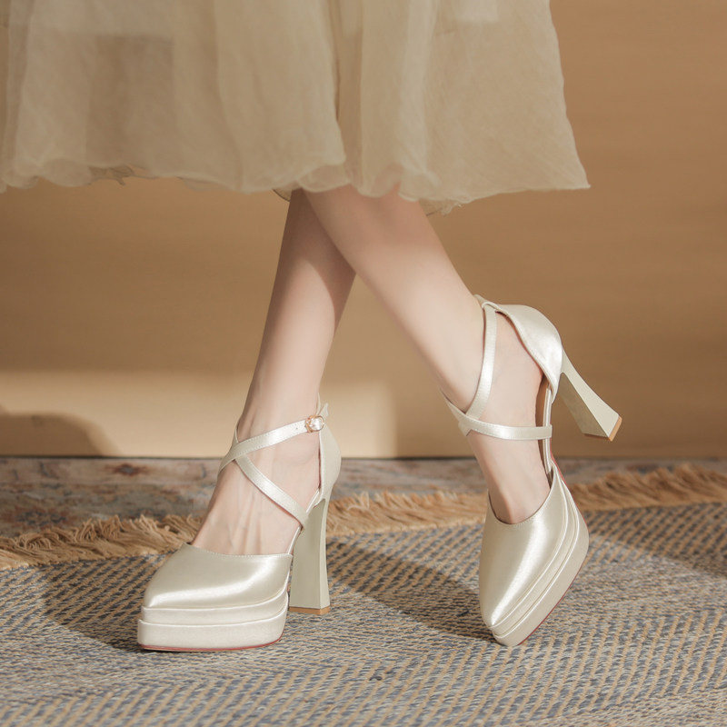 不累脚玛丽珍新娘主婚纱鞋粗跟厚底神器防水台高跟鞋女订婚水晶鞋