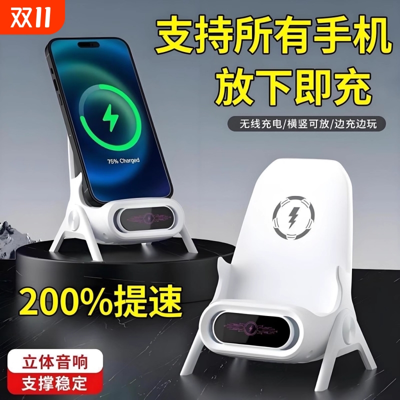 2025最新款手机无线充电器椅子支架安卓通用手机支架桌面横竖扩音自动感应立体音箱