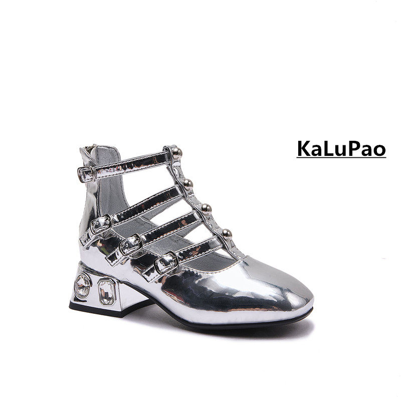 KLP模特T台走秀高跟镂空粗跟浅口高帮银黑白色漆皮女童公主表演鞋