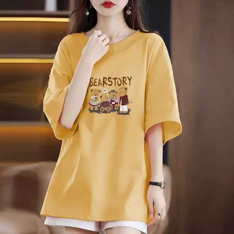 姜黄t恤女中长款韩版宽松大码慵懒风2026夏季新款短袖纯棉上衣ins