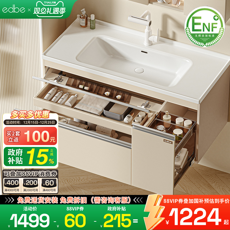 edbe日式收纳柜enf实木浴室柜组合陶瓷一体盆卫生间洗手盆洗簌台