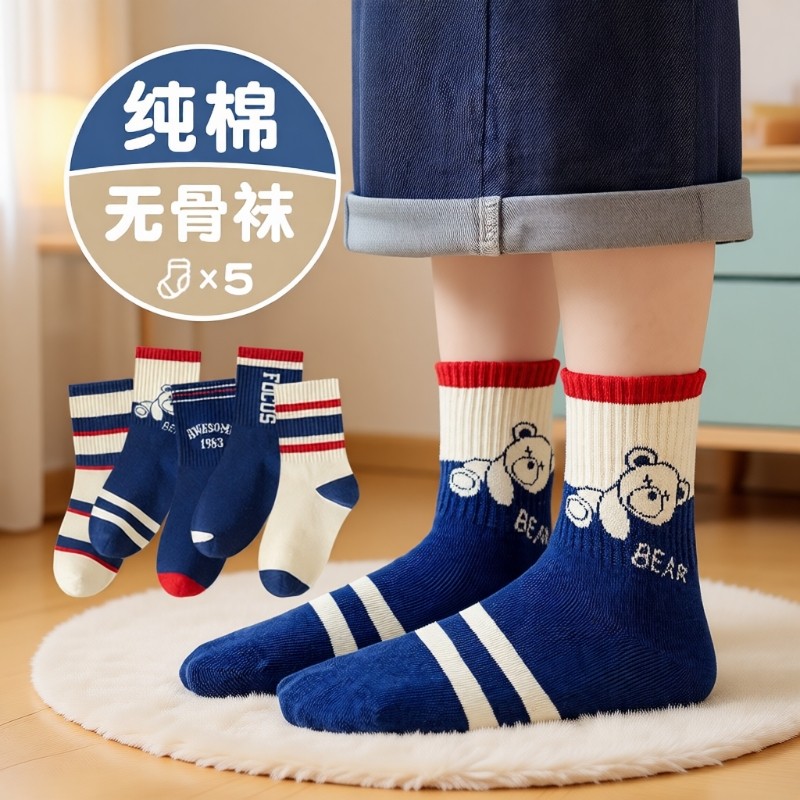 斑比童袜男童袜子春秋款棉袜大童男孩秋冬季青少年儿童无骨中筒袜