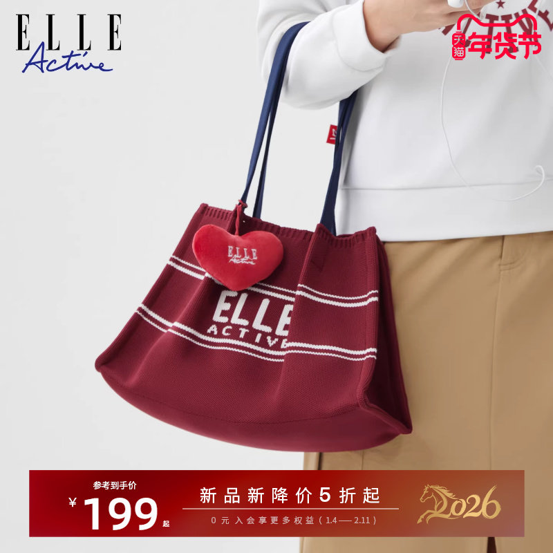 ELLE Active户外休闲红色女包运动风飞织字母托特包大容量斜挎包