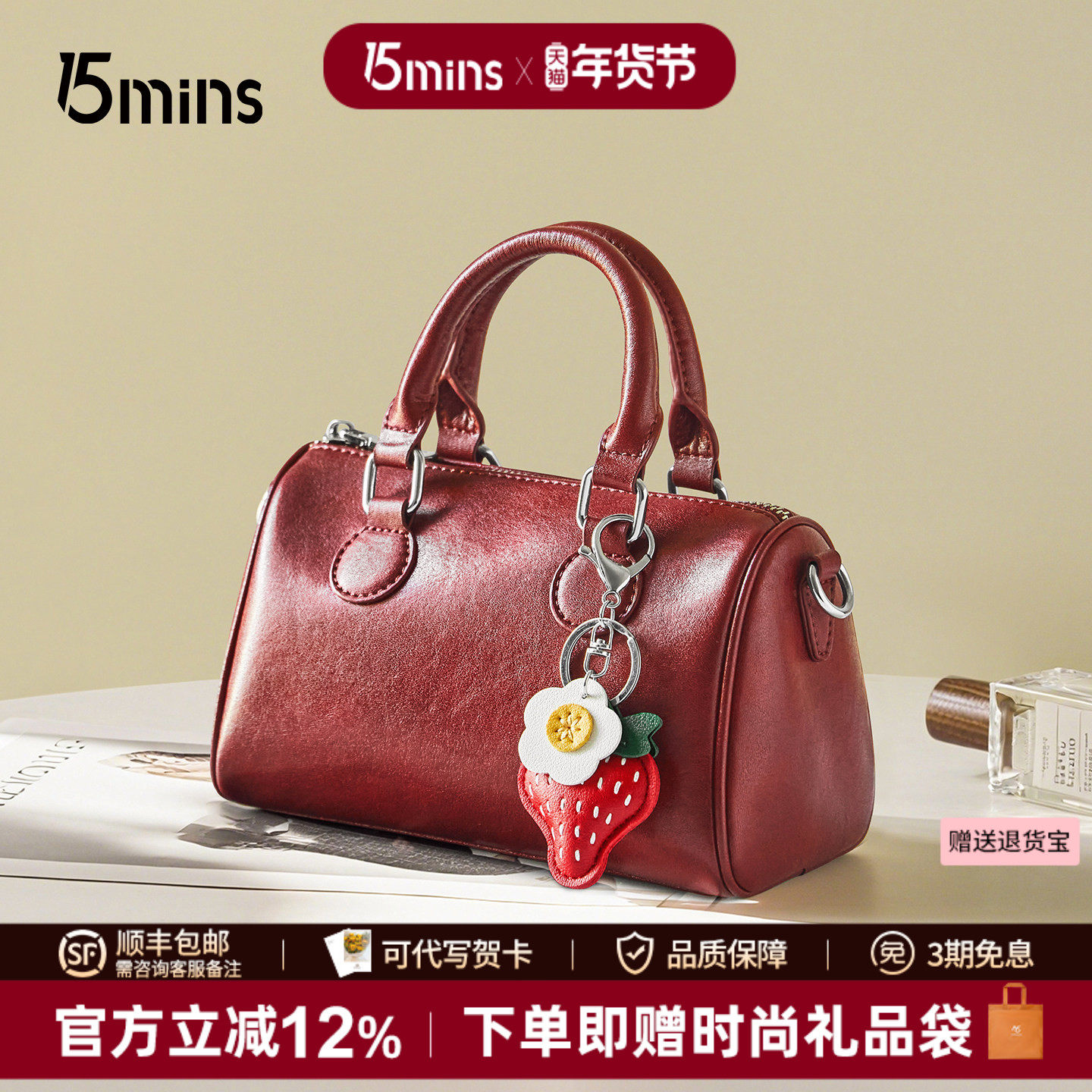 15MINS红色包包2025新款时尚百搭保龄球包手提斜挎包通勤新年女包