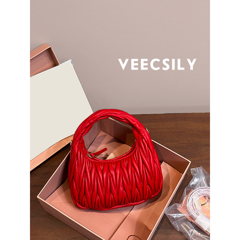 高定~2025新款小羊皮手提包月牙褶皱腋下包时尚潮流百搭红色女包