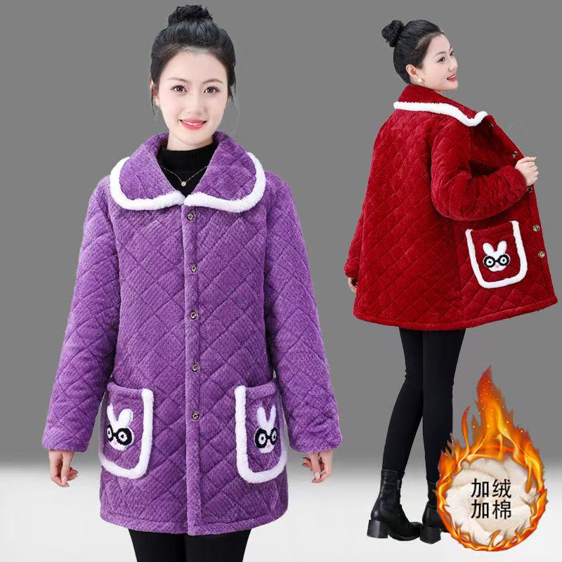 妈妈装德绒开衫女秋冬宽松外穿加绒外套居家秋衣大码保暖打底上衣