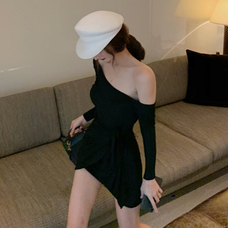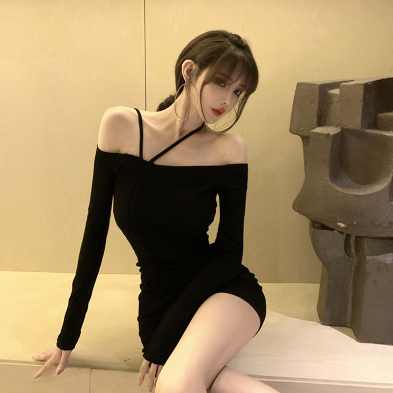 2021蹦迪女装气质紧身裙子斜肩秋装新款性感包裙约会裙连衣裙露肩