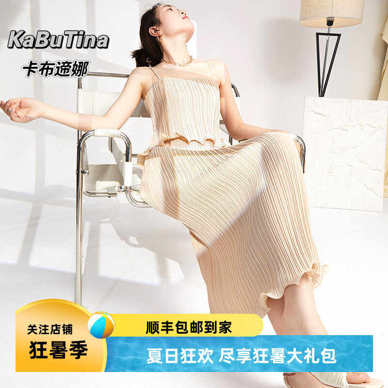 kabutina时尚套装女性感吊带连衣裙木耳边长款高腰包裙一步裙褶皱