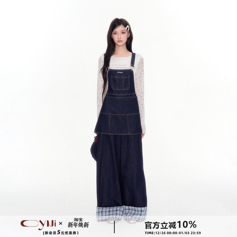 CyNi 宽松复古可调节阔腿牛仔裤格子拼接可拆卸屁帘宽松背带裤女