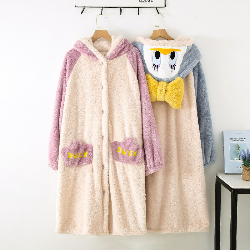 秋冬法兰绒睡袍女士保暖加厚珊瑚绒连帽家居服甜美卡通中长款浴袍