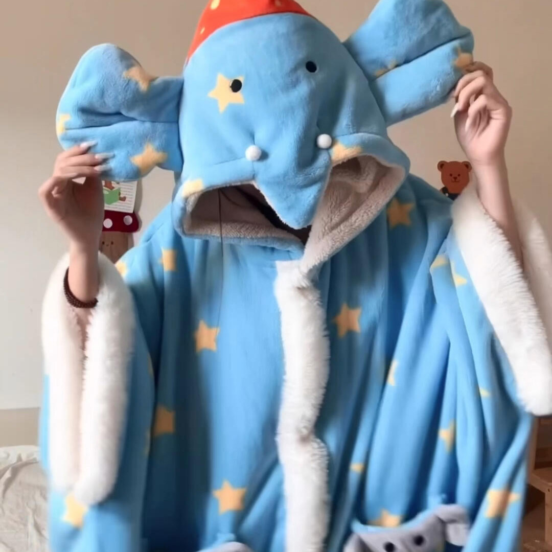 侘町2025年秋冬季新款笨笨大象法兰绒睡袍女卡通可外穿家居服斗篷