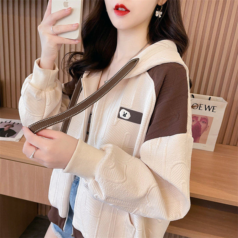 韩版撞色白边拉链连帽卫衣女宽松加绒加厚冬季新款开衫外套学生潮