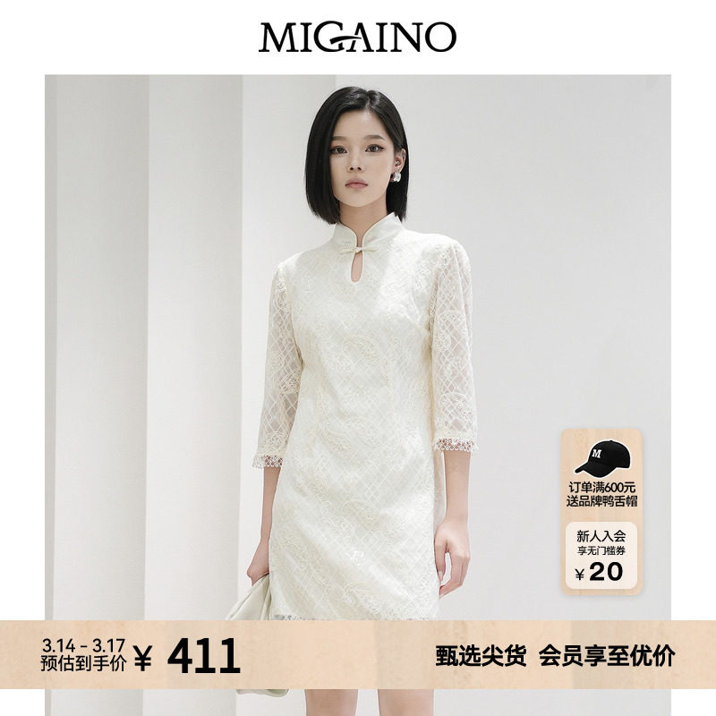 Migaino曼娅奴女装秋冬新款别致优雅新中式修身蕾丝绣花连衣裙