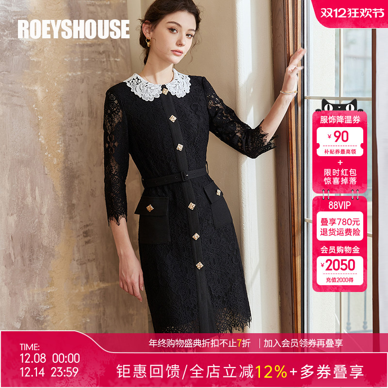 罗衣气质拼接蕾丝连衣裙女2025秋装新款黑色修身娃娃领裙子08051