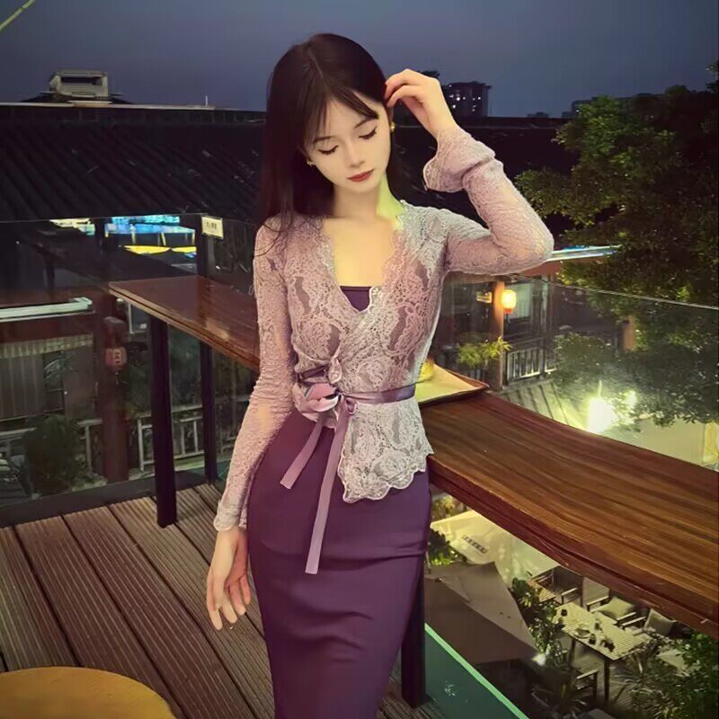 春秋新款紫色外套吊带连衣裙两件套蕾丝绑带修身性感吊带裙子套装