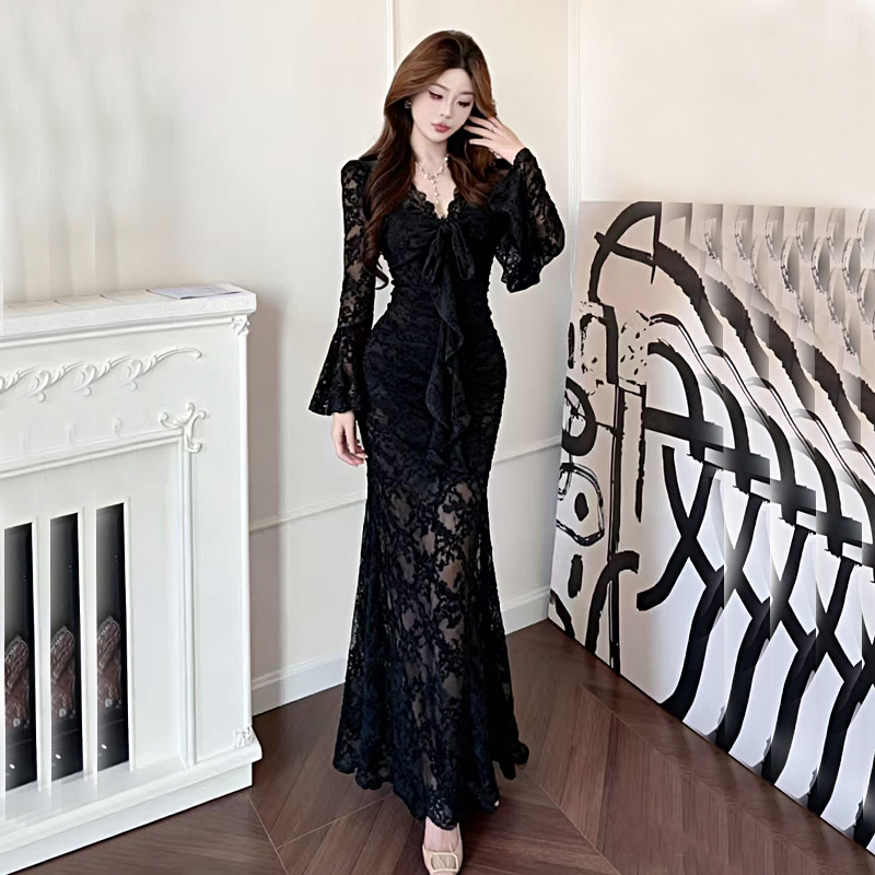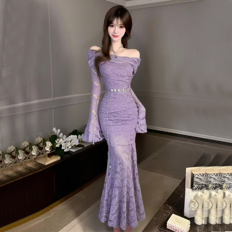 2025秋季新款修身显瘦包臀鱼尾裙年会长裙蕾丝一字领连衣裙送腰链