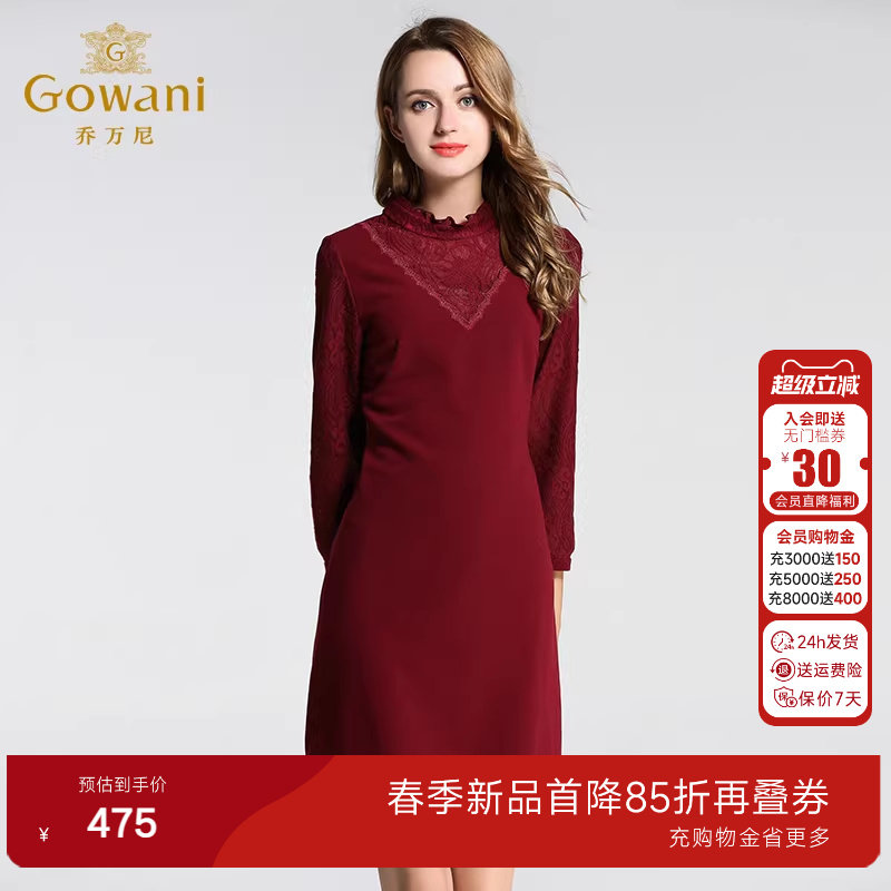 乔万尼婆婆礼服红裙子女秋装女装新款简约高腰修身蕾丝长袖连衣裙