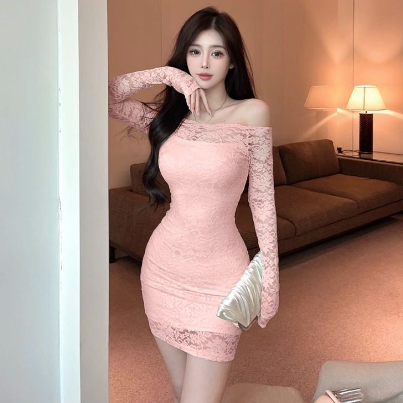 秋日絮语 清楚系优雅温柔浅粉露肩连衣裙女气质修身蕾丝长袖长裙