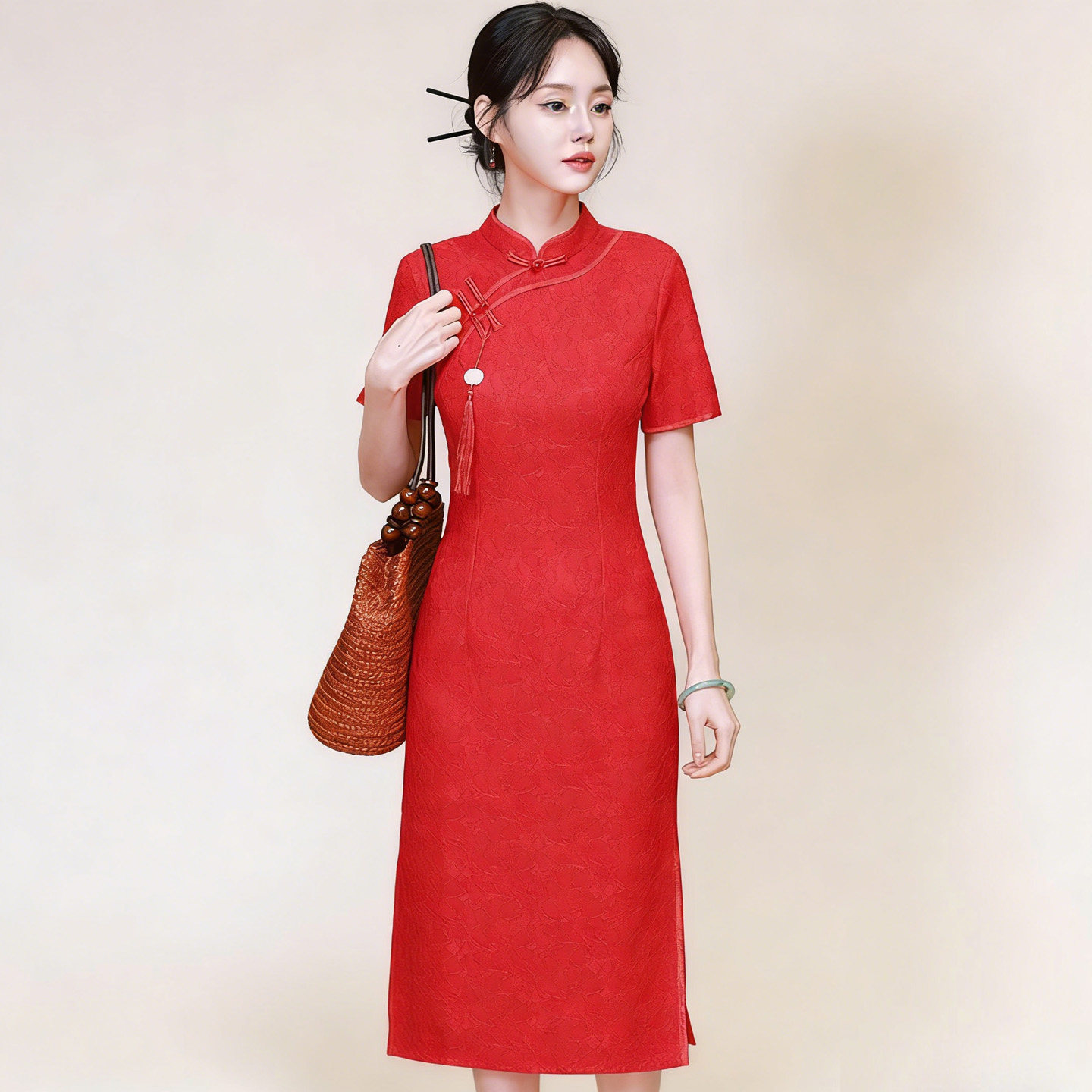 蕾丝连衣裙女春秋韩版新款修身气质刺绣旗袍连衣裙红色显瘦遮肚子