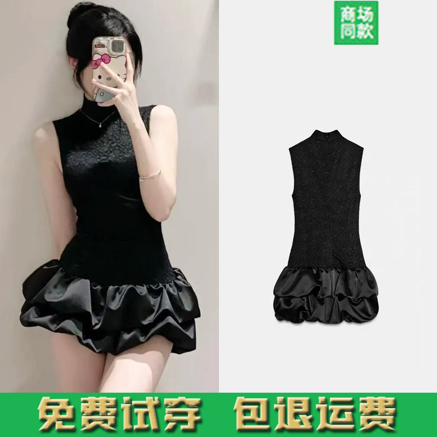 2025年秋季新款立领设计泡泡袖修身直筒撞色扇形双色蕾丝连衣裙女