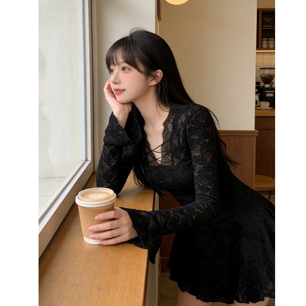 纯欲风性感V领蕾丝拼接长袖连衣裙女春秋线带高级感修身显瘦A字裙