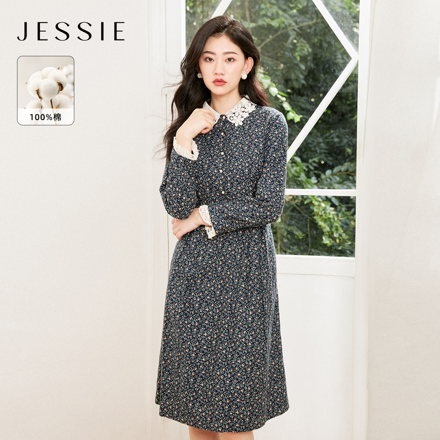 JESSIE气质蕾丝花边领碎花修身X型棉连衣裙女装收腰显瘦秋季新款