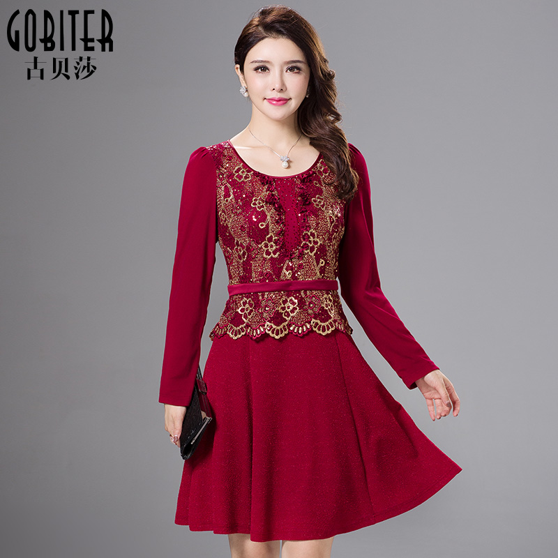 古贝莎品牌春秋圆领蕾丝刺绣红色婚宴礼服结婚妈妈装修身连衣裙女