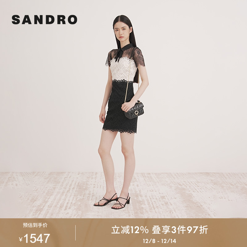 SANDRO Outlets秋冬女装法式修身黑白蕾丝拼接翻领系带短款连衣裙