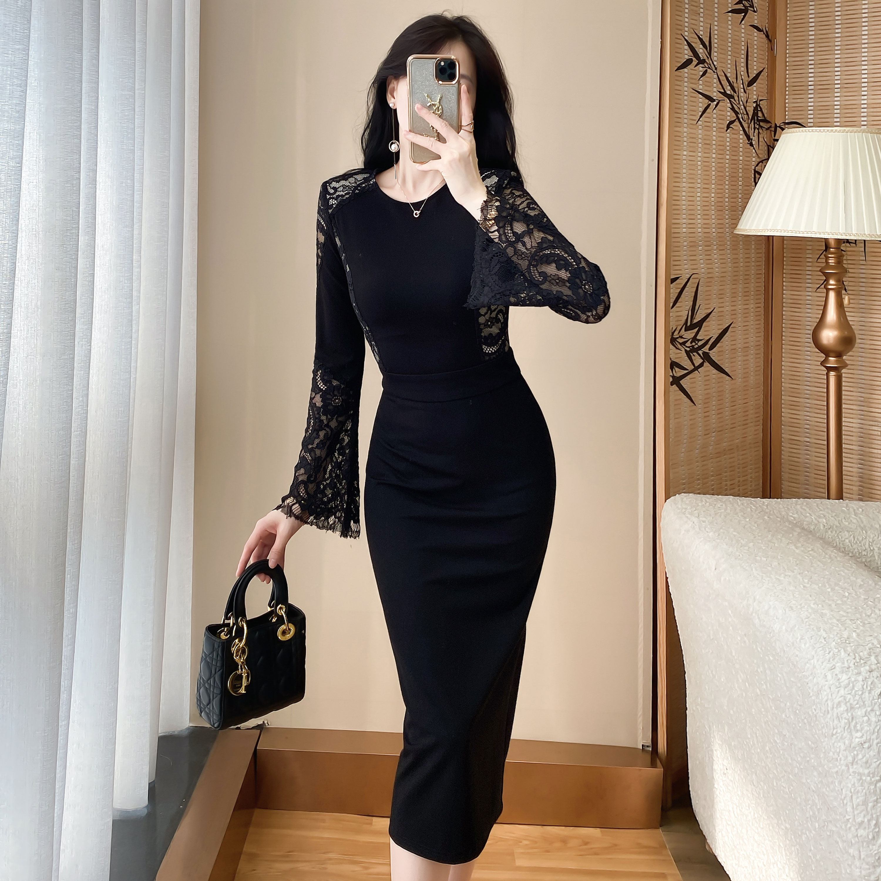 蕾丝连衣裙女装2025新款春秋高级感气质名媛修身显瘦中长款包臀裙