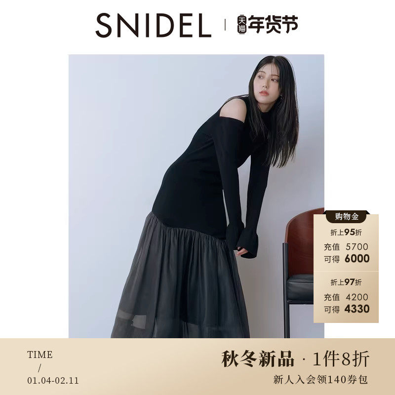 SNIDEL2025秋冬新品优雅圆领露肩喇叭袖针织鱼尾连衣裙SWNO255083