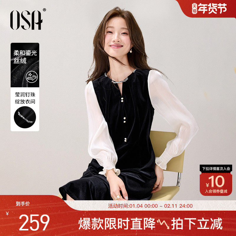 OSA欧莎假两件丝绒连衣裙女2025年秋冬新款新年年会约会鱼尾裙子