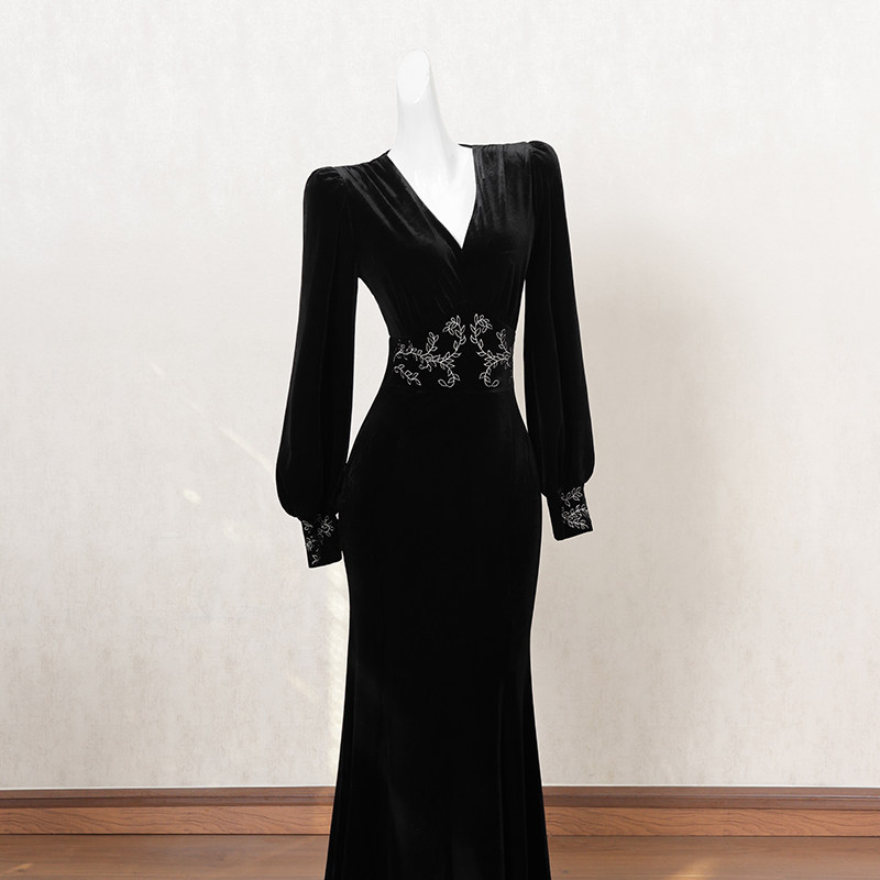 黑色复古丝绒鱼尾连衣裙女冬季长裙小众设计感御姐风高端礼服裙子