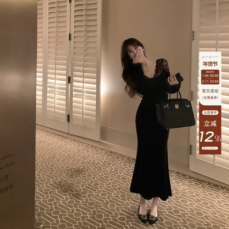 加绒加厚蕾丝连衣裙冬装新款黑色V领修身显瘦包臀鱼尾裙年会长裙