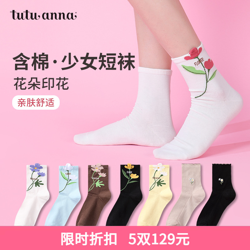 tutuanna春夏女士中筒袜 纯色花朵刺绣印花棉质透气百搭短袜女