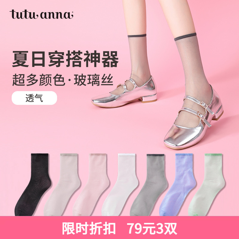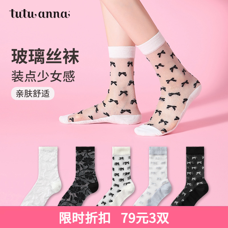 tutuanna玻璃丝袜子女夏季薄款刺绣芭蕾风袜子印花水晶凉鞋袜女