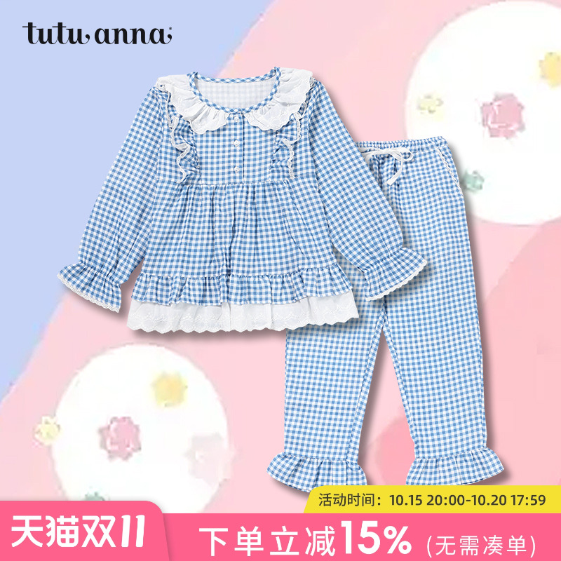tutuanna家居服睡衣套装公主风儿童格子荷叶边蕾丝长袖长裤两件套