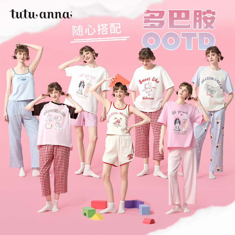 tutuanna春夏全棉凉感睡衣女 多巴胺系列可外穿休闲短袖家居服女