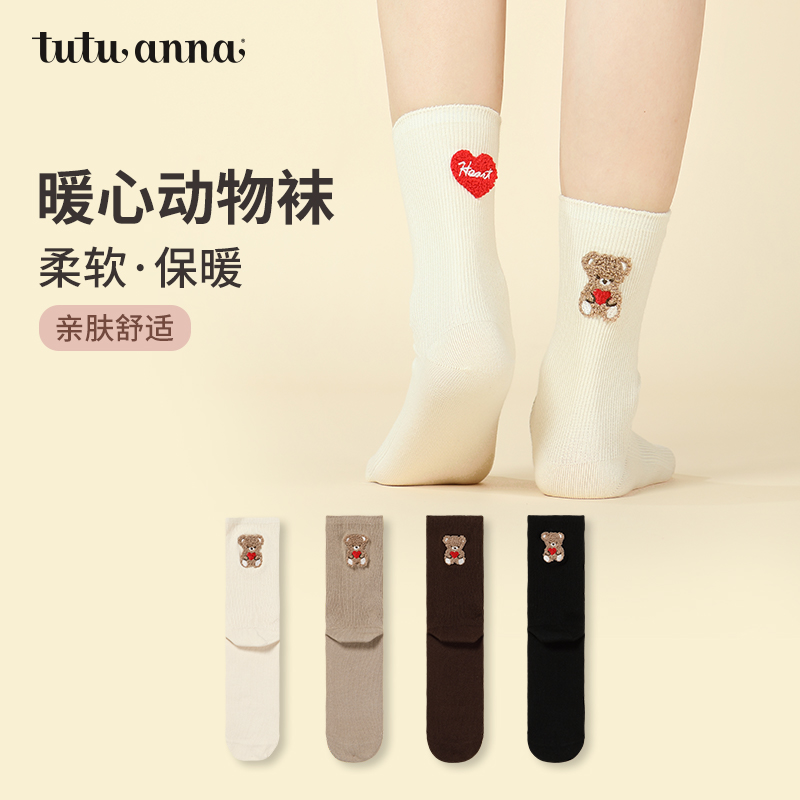tutuanna秋冬短袜女可爱小熊刺绣棉质针织短袜纯色百搭透气不勒脚
