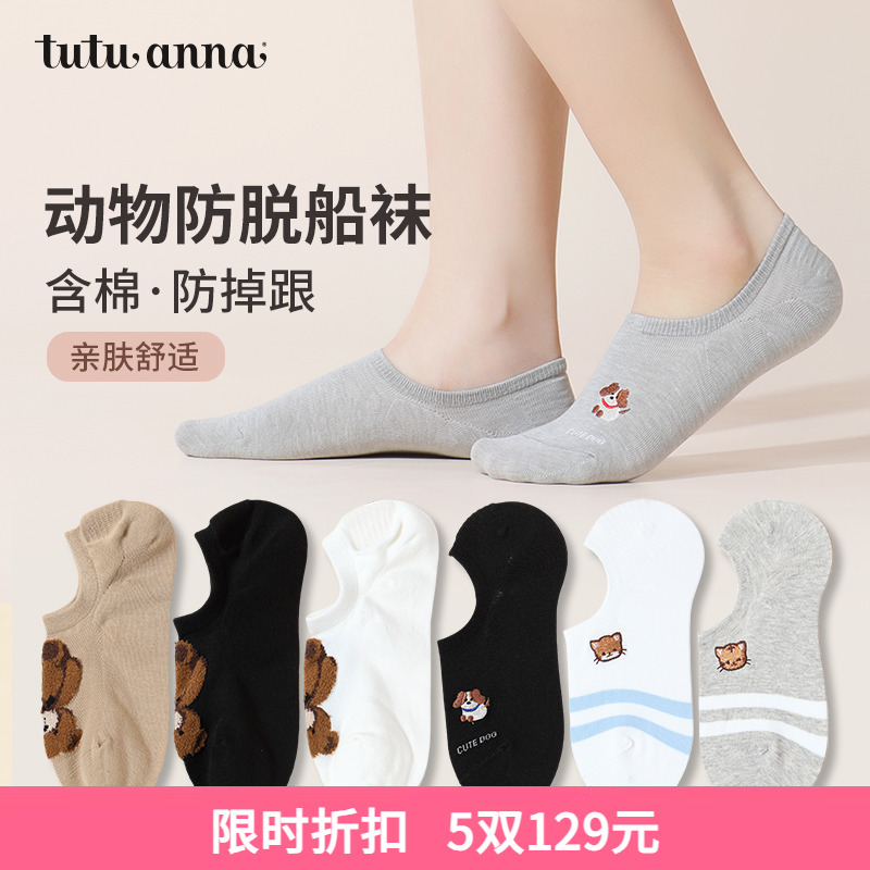 tutuanna春秋船袜女棉质可爱纯色动物刺绣隐形浅口柔软不掉跟船袜
