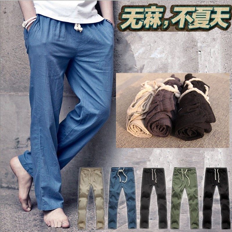 纯亚麻男士休闲裤夏季薄款裤子男宽松直筒裤中国风松紧腰凉感长裤