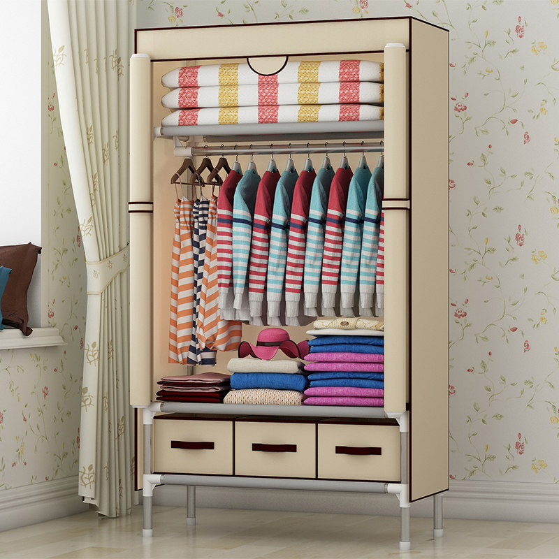 衣柜简易布衣柜带抽屉组装钢架出租房用单人收纳柜布艺衣橱经济型