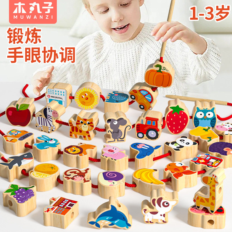 儿童木制益智串珠大颗粒积木玩具动物水果穿绳串串珠益智玩具0-3