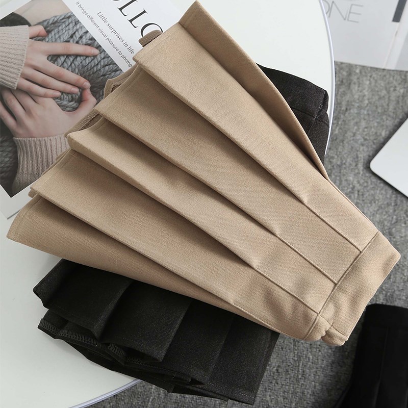 DDXZ夕子韩系学院风气质纯色短裙小香风卡其色呢子细边时尚百褶裙