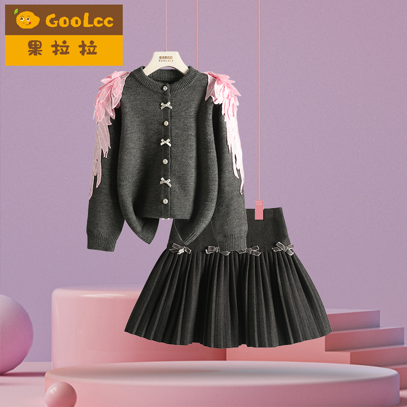 果拉拉女童套装裙子儿童针织开衫灰色呢子百褶裙两件套2025春秋装