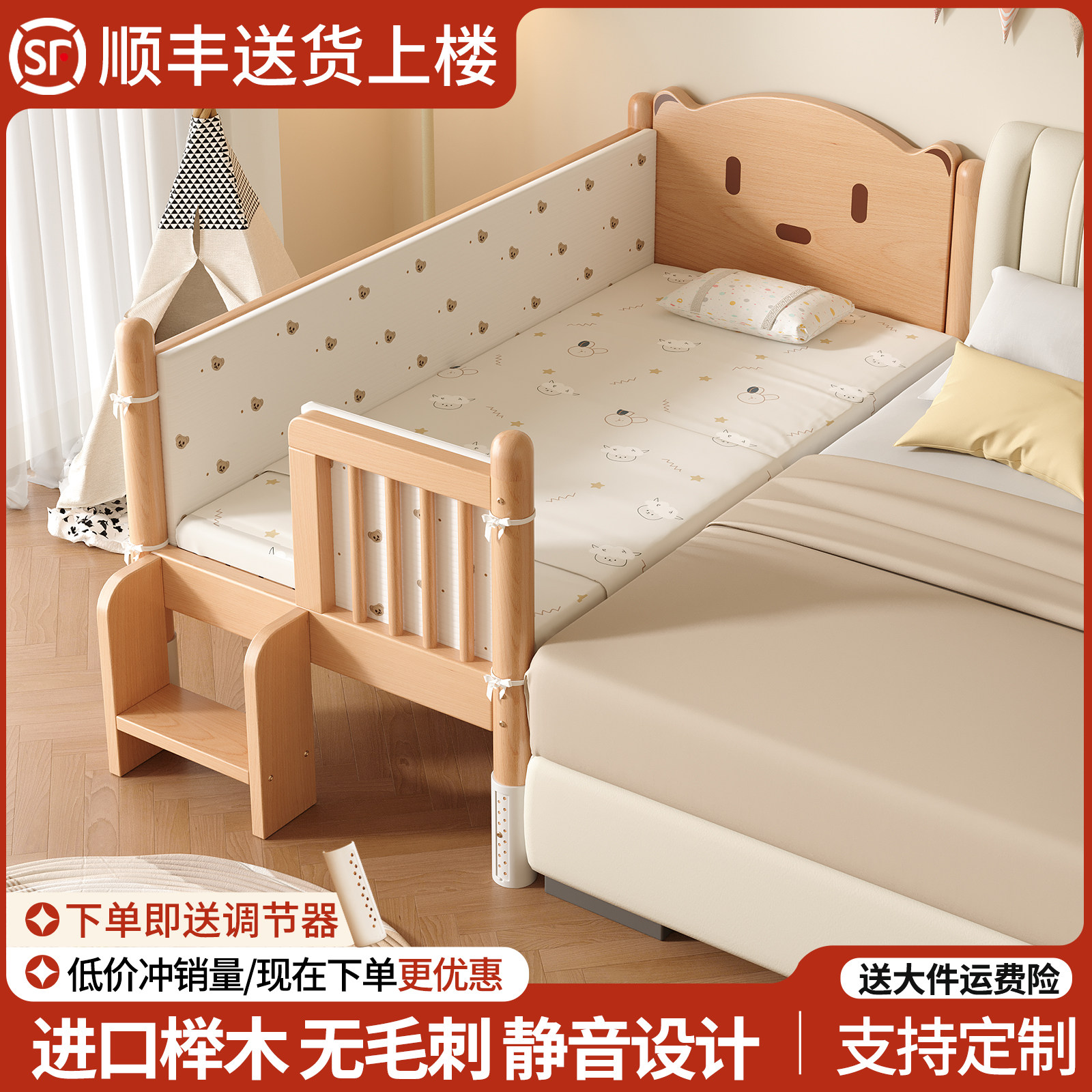 榉木拼接床可调单人床大床带护栏床边加宽宝宝婴儿床实木床儿童床
