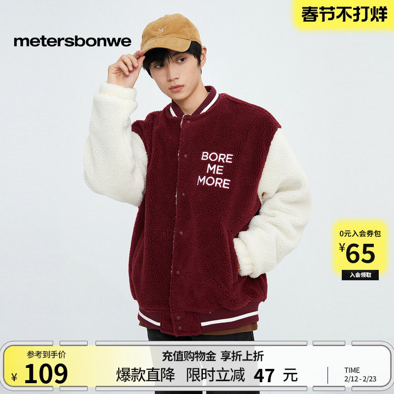 美特斯邦威红色棉衣男秋季新款舒适羊羔绒夹克字母潮流宽松棒球服