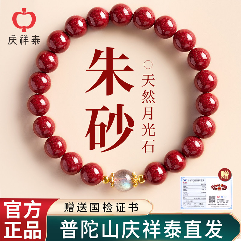 庆祥泰真朱砂手串女士正品官方旗舰店天然白月光石手链礼物送女友
